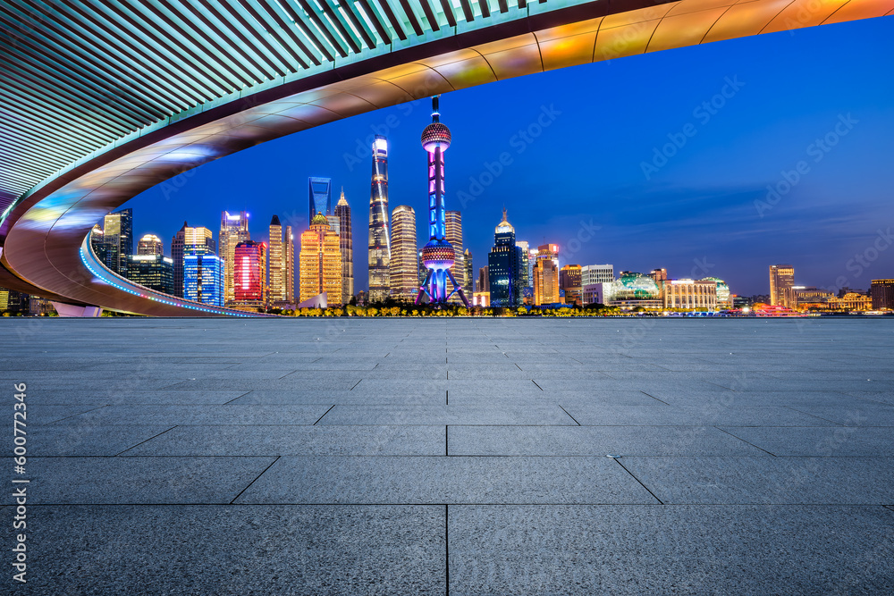 Empty square floor and city skyline with modern buildings in Shanghai, China.