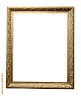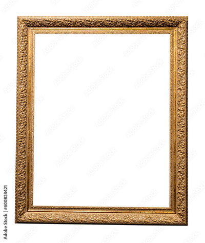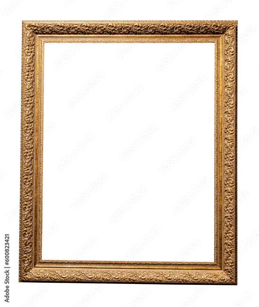 old vertical golden wooden picture frame isolated on white background with cut out canvas