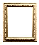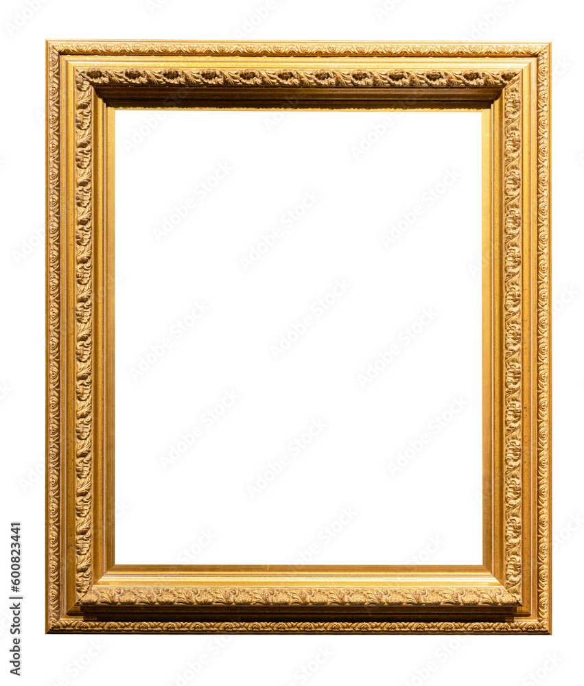 old vertical carved yellow wooden picture frame isolated on white background with cut out canvas