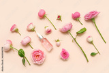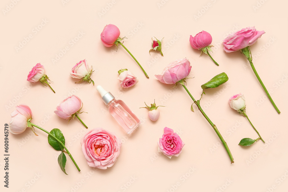 Bottle of cosmetic oil with rose extract and flowers on beige background
