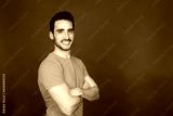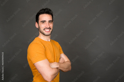 Smiling young man in yellow shirt with arms crossed on gray background