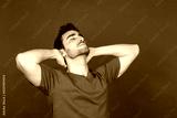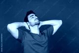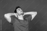 Relaxed young man with hands behind head in studio portrait.