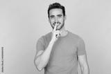 Young man making quiet gesture in studio