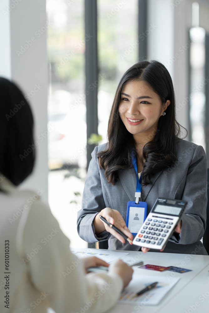 Young Asian businesswoman, company employee offering credit limit and interest rate calculation to customer for credit card Paying on the table at the office loan concept approval limit.