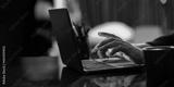 Businessman working remotely, typing on laptop keyboard over neon lights. Home office in neon lights. Concept of business, modern technologies, occupation, career development