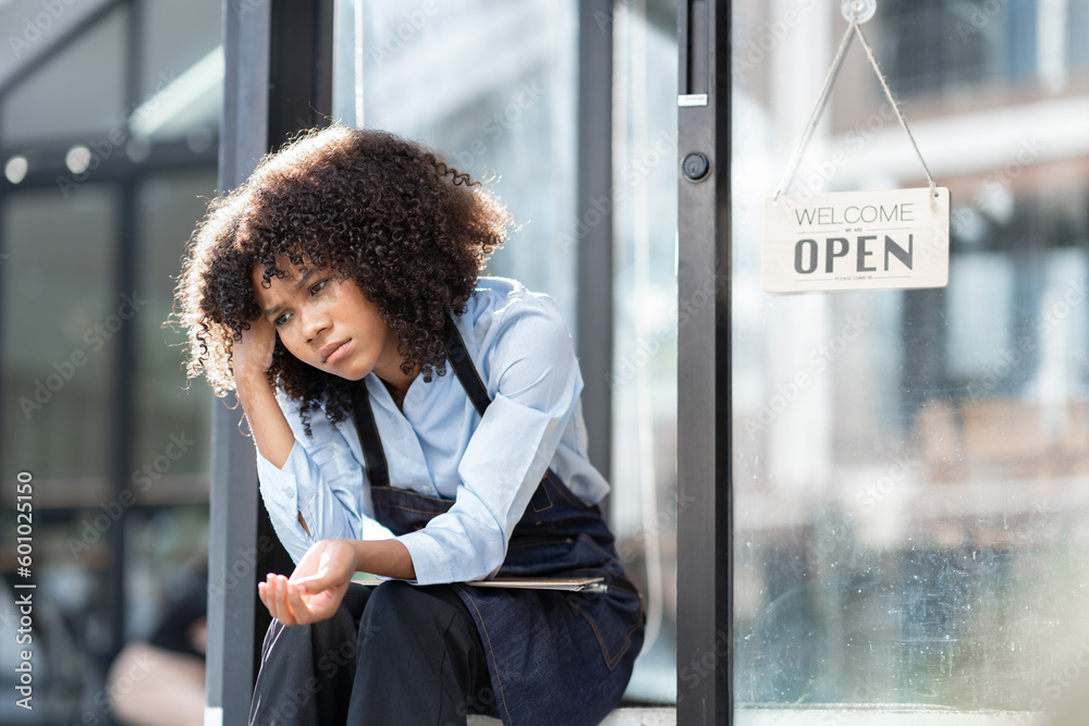 African barista woman in a barista uniform holding file showing stress and frustration sitting the entrance of a coffee shop there are no customers at the store