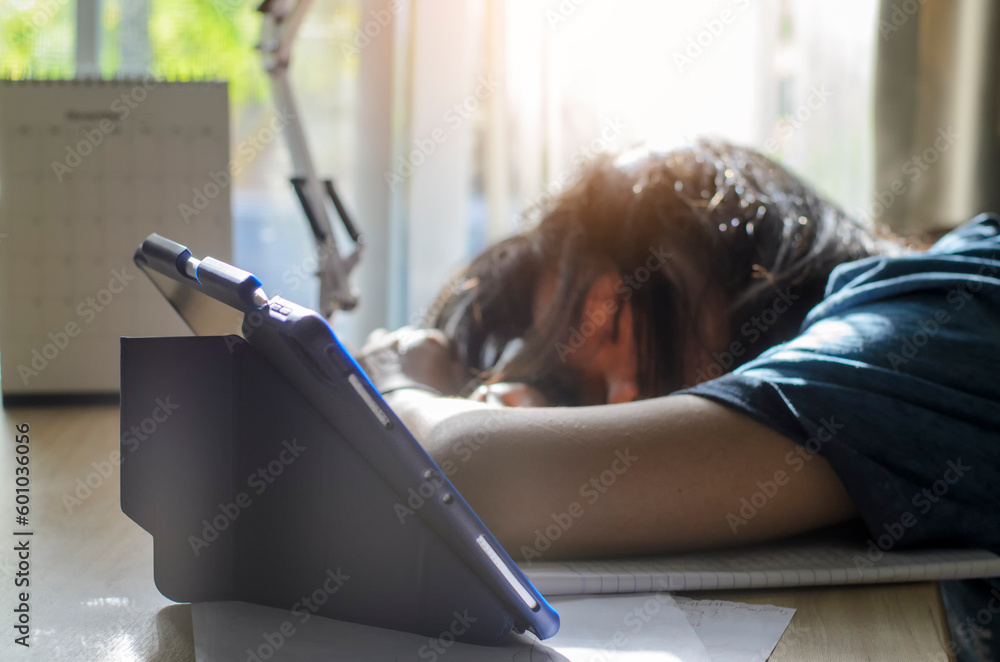 Asian children using tablet and laptop to learn and do homework at home. Tired Thai Students study online to study for the exam. Education concept