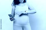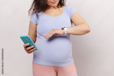 Closeup beautiful pregnant woman holding mobile phone, checking her smart wrist watch, counting baby kicks or movements, making notes in new pregnancy mobile application, isolated on white background
