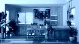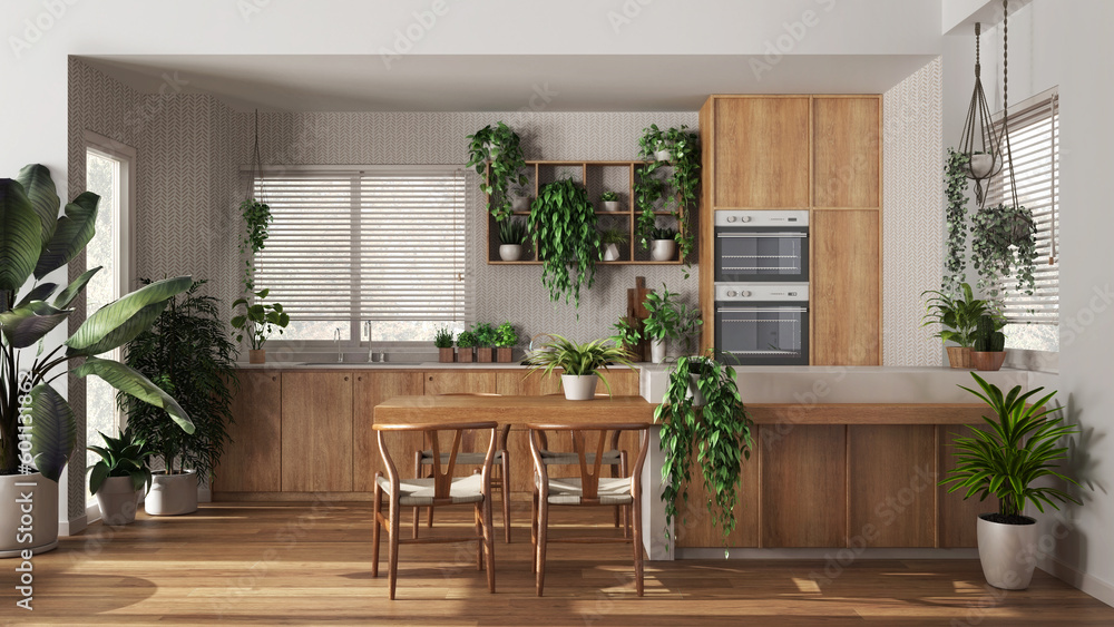Urban jungle interior design, wooden kitchen in white and beige tones with many houseplants. Island with chairs and appliances. Biophilic concept idea
