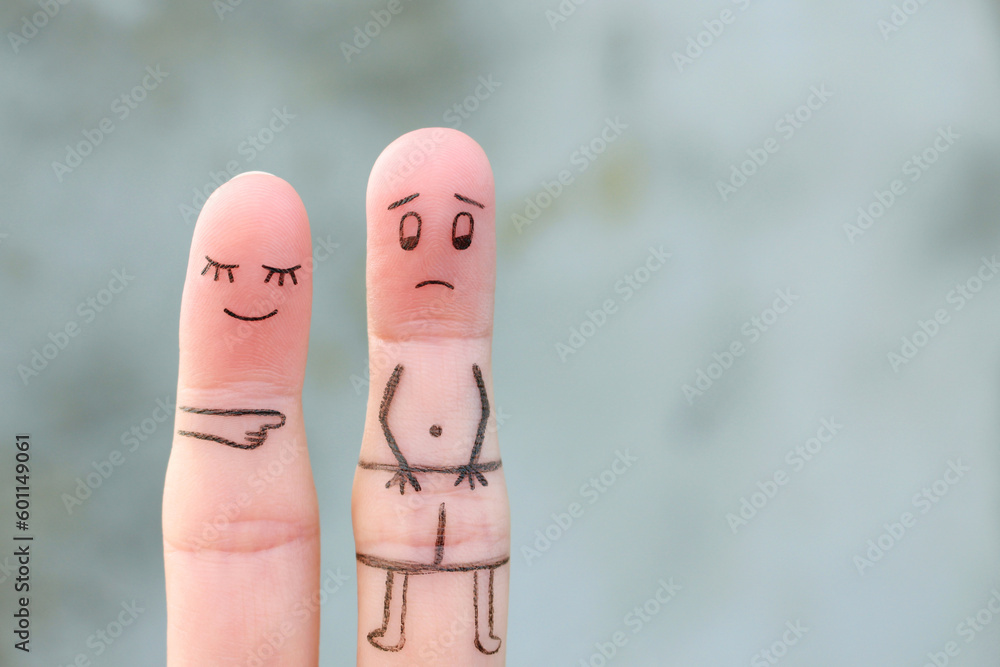 Fingers art of the wife laughs at her husband. Concept of impotence. Divorce.