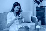 Food delivery. Happy asian woman eating noodles with chopsticks unpacking takeaway food at home.
