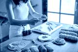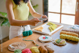 Hand crafts concept, Woman leisure embroidery at home..