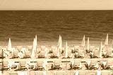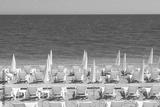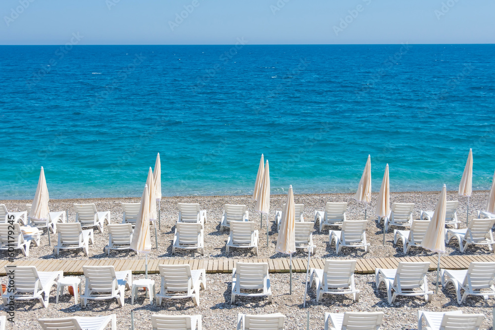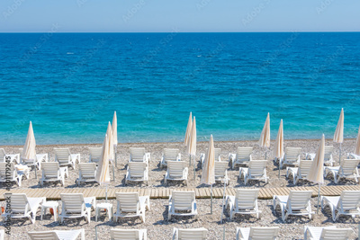 Landscape with white beach umbrellas and sun loungers on the sand beach.