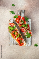 Italian bruschetta with tomatoes, cheese on a wooden board, banner, menu, recipe place for text, top view