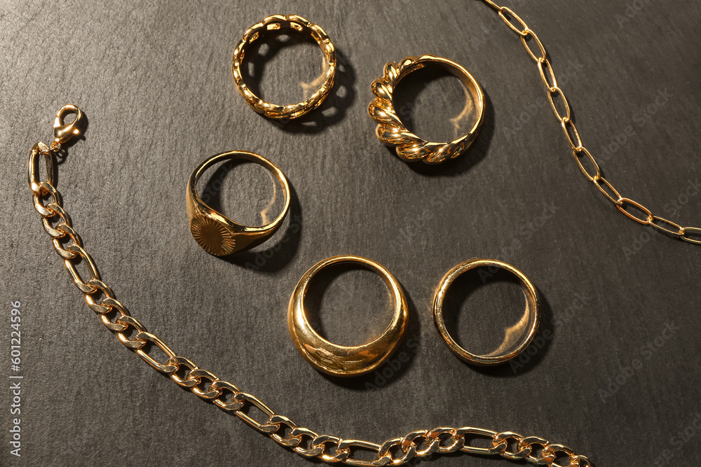 Beautiful rings and chain necklace on black background
