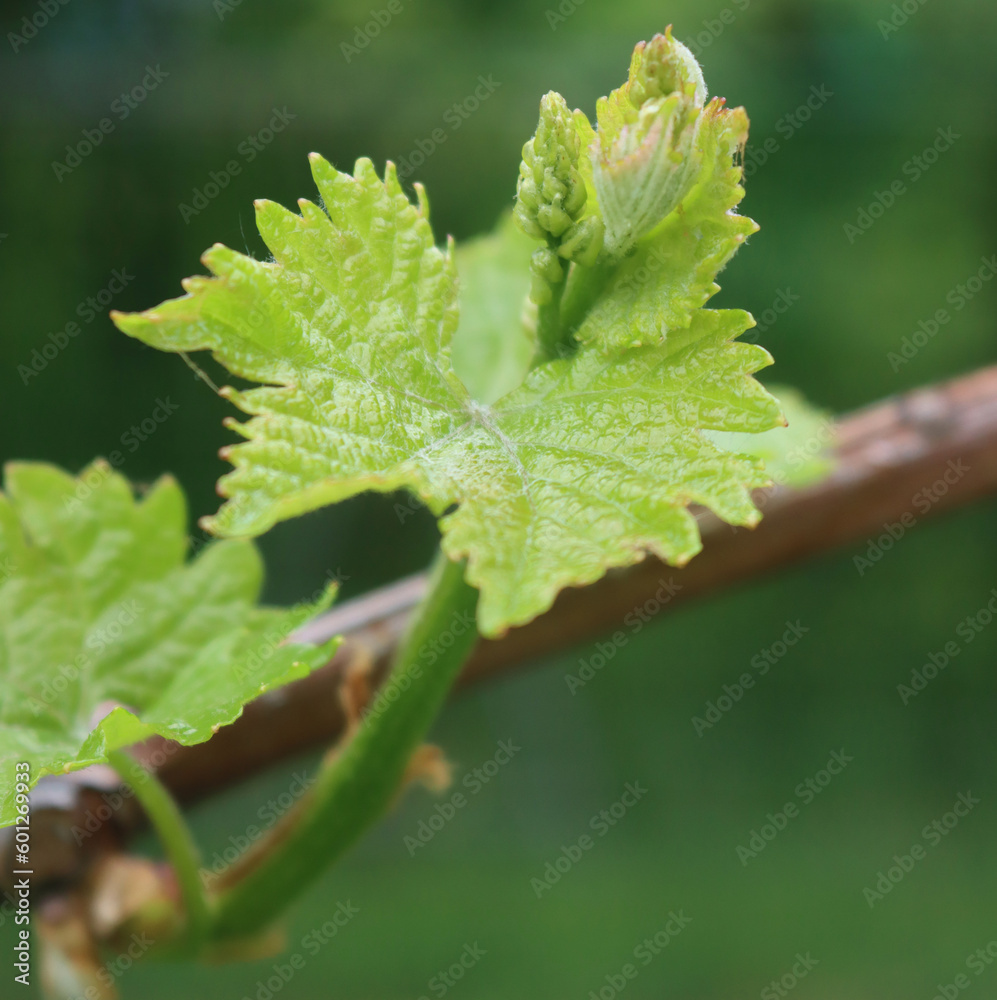 Close-up of new fresh leaves and fruits of Glera Vine plants growing in the vineyard in the northern Italy countryside . Vitis vinifera cultivation
