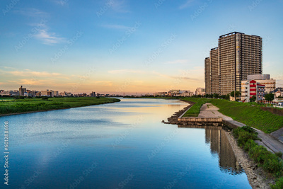 夕方の多摩川下流域の風景【神奈川県・川崎市-東京都・大田区】 Scenery of the lower Tama River basin in the evening - Kanagawa, Tokyo, Japan