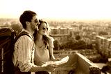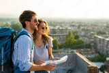 Happy couple on vacation sightseeing city with map. People travel fun love concept.