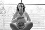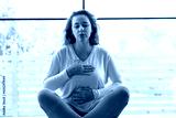 Front view of a relaxed woman doing breathing exercise at home