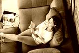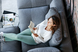 High angle shot of a young woman reading a book on the sofa at home