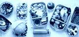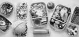 Restaurant healthy food delivery in take away boxes for daily nutrition on white background.