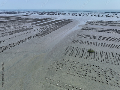Aerial view of Oyster farm. Sustainable farming. Oyster farming is an aquaculture practice. Oyster farming at Ang Sila town, Chonburi, Thailand. Landscape oyster beds at low tide on summer sunny day.