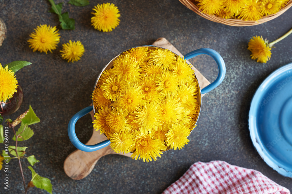 Fresh dandelion flowers in a pot on a table