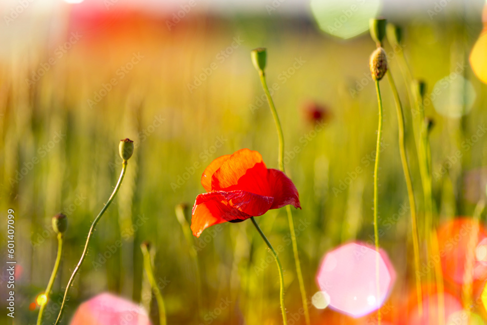 Green background with poppies, flowers, ears of wheat or erysipelas, cornflowers, weeds. Field outside the city