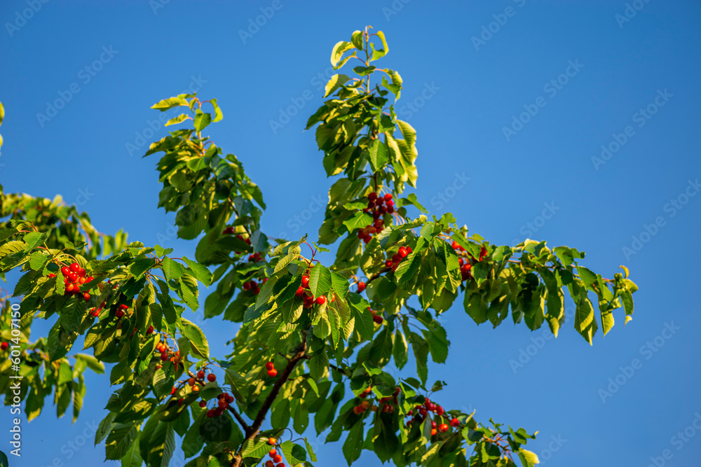 Sweet cherry on branches with leaves on a cherry tree against a blue sky. Harvest ripe cherries in the garden