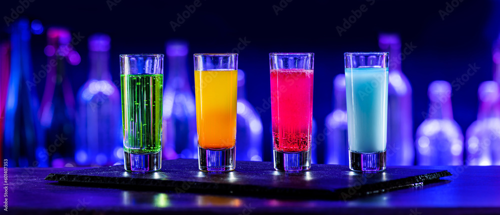 Cocktails Party Shots and Shooters on bar counter in a restaurant, pub. Miniature mixed drinks. Alcoholic cooler beverage at nightclub on dark background