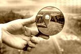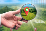 Geotag with house. Magnifying glass over construction site. Territory for construction of site. Realtor's hand with loupe. Selling land for building house. Place for cottage near forest