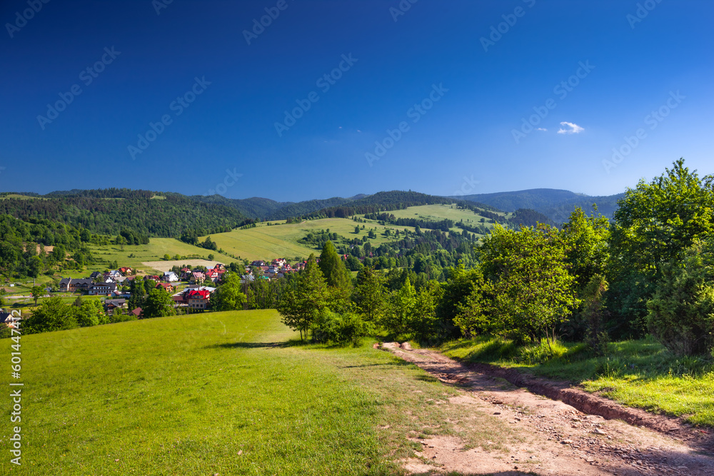 Bacówka w Jaworkach i okolice. Piękny krajobraz domów położonych w górach pośród drzew.