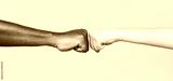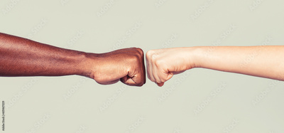 Closeup of multicultural friends giving fist bump to each other. Black African. American race male and woman hands giving a fist bump, multiracial diversity, immigration concept