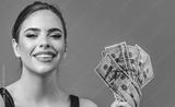 Luxury, beauty and money concept. Woman with dollars in hand. Girl holding cash money in dollar banknotes. Woman holding lots of money in dollar currency