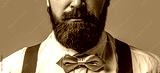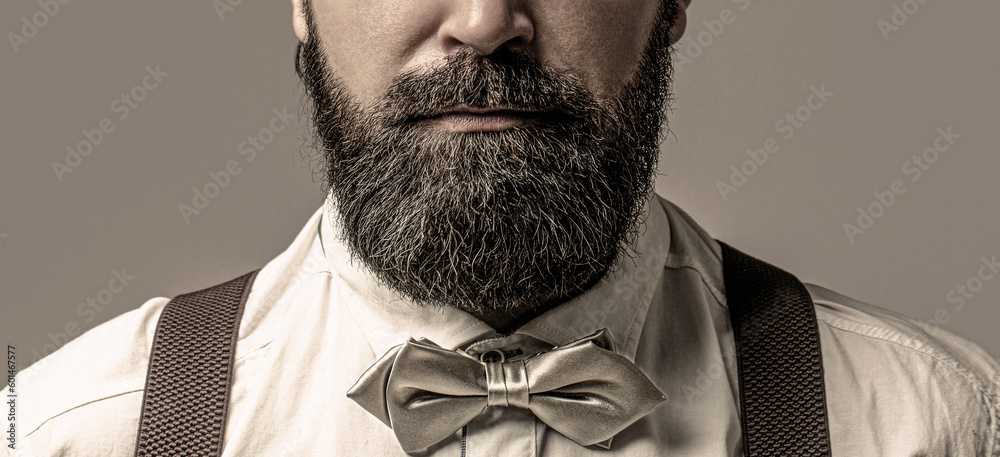 Male in shirt correcting his colorful tie. Portrait of handsome bearded man in white shirt and bow tie, suspenders