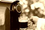 coffee capsule machine Side view of espresso machine making coffee with blur nature background for copy space. Woman taking coffee out of the capsule machine to drink at the moment