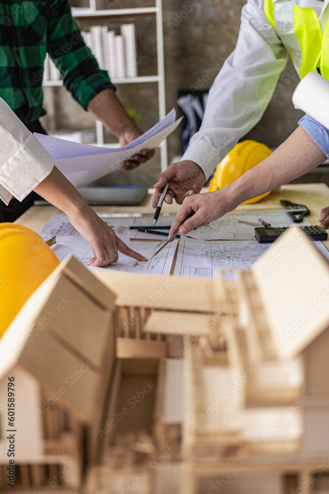Engineer team meeting and talking using laptop Blueprints and papers on table with yellow hat house model in office, project manager discussing meeting with colleague