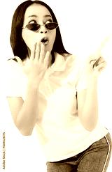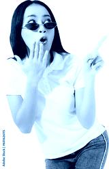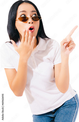 Excited screaming young woman standing isolated over white background Looking at blank space Surprised young lady shouting points at upper right corner Shocked excited young lady pointing aside space