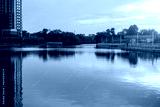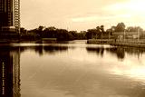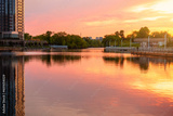 Sunset on the embankment in Kyiv. Poznyaki Park near the River Mall.