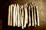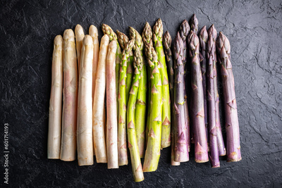 Top view of green, purple and white asparagus sprouts on black background closeup. Food photography
