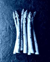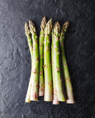 Top view of green asparagus sprouts on black background. Food photography