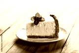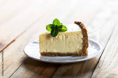 Piece of classic New York cheesecake with a sprig of mint on a plate on a wooden table. The concept of bakery and sweet cakes desserts