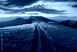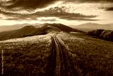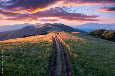 Rural road and beautyful pink dramatic sky in summer mountains. Lush green grassy meadows in fantastic evening sunset light. Landscape photography