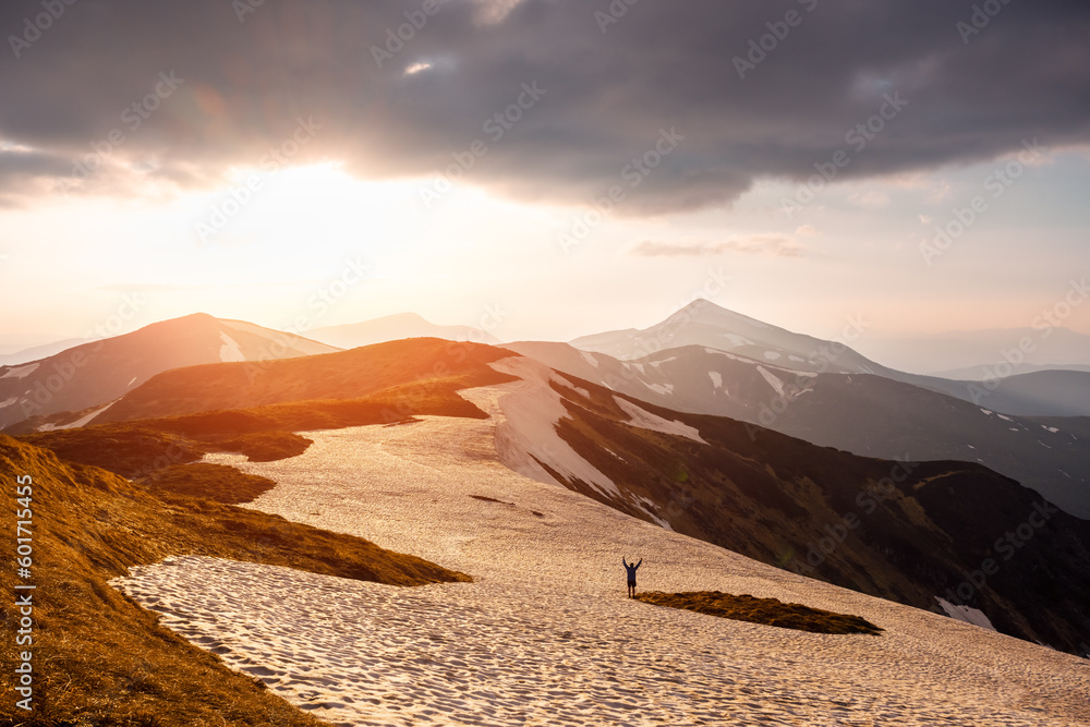 Lonely tourist on snowy mountains during incredible sunset. Dramatic spring scene. Landscape photography