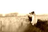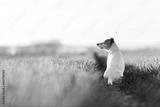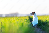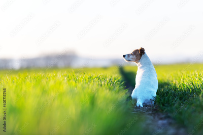 Jack russel terrier puppy on green field on sunset time. Happy Dog with serious gaze. Animal photography