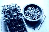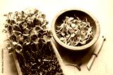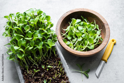 Growing microgreens at home. Harvest of milk thistle microgreens sprouts. Fresh micro greens closeup. Food photography