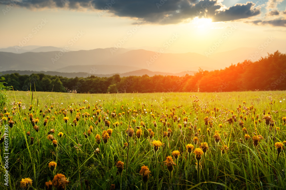 Amazing scene in summer mountains. Lush green grassy meadows with yello flowers in fantastic evening sunlight. Carpathians, Europe. Landscape photography