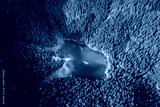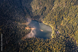 Aerial view of wild lake in summer mountains. Lake surrounded by dense forest. Landscape photography