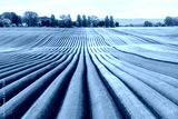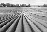Agricultural field with even rows in the spring. Growing potatoes