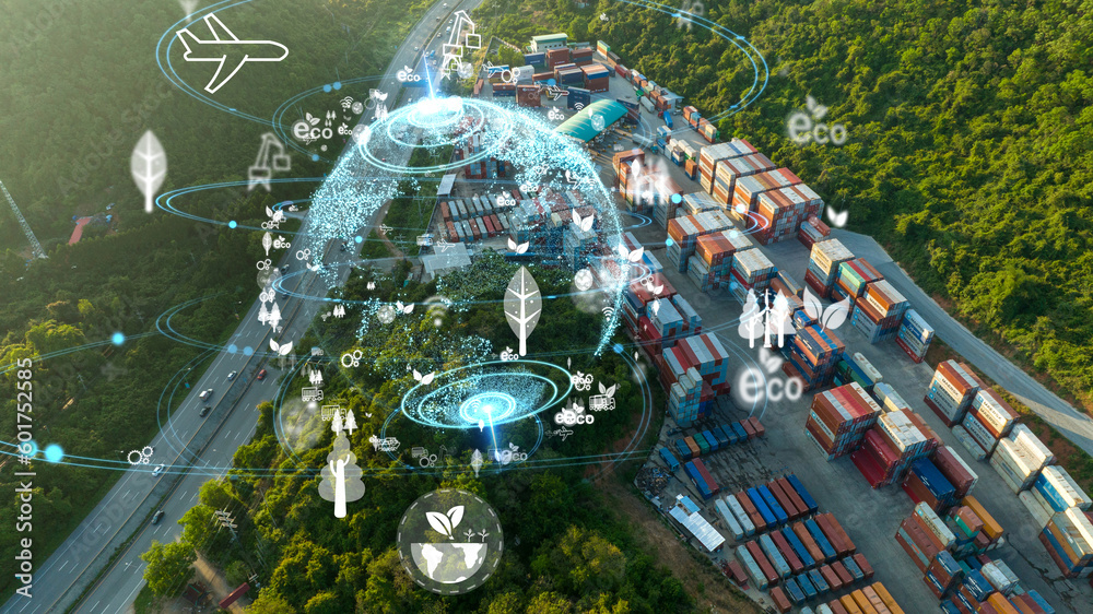Icon representing the ecological green transportation. Cargo Container yard next the road and surrounded by mountains , forklift truck and cargo at depot working shipping green logistics